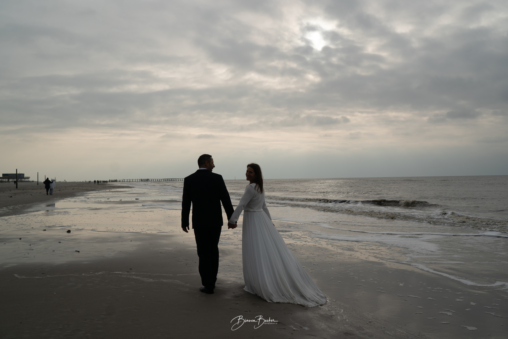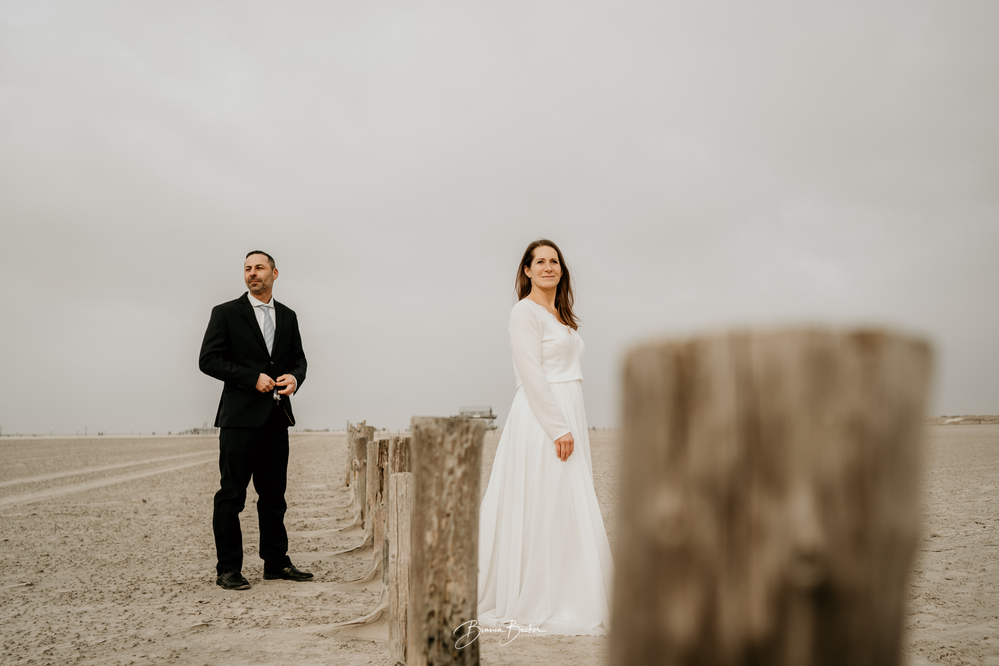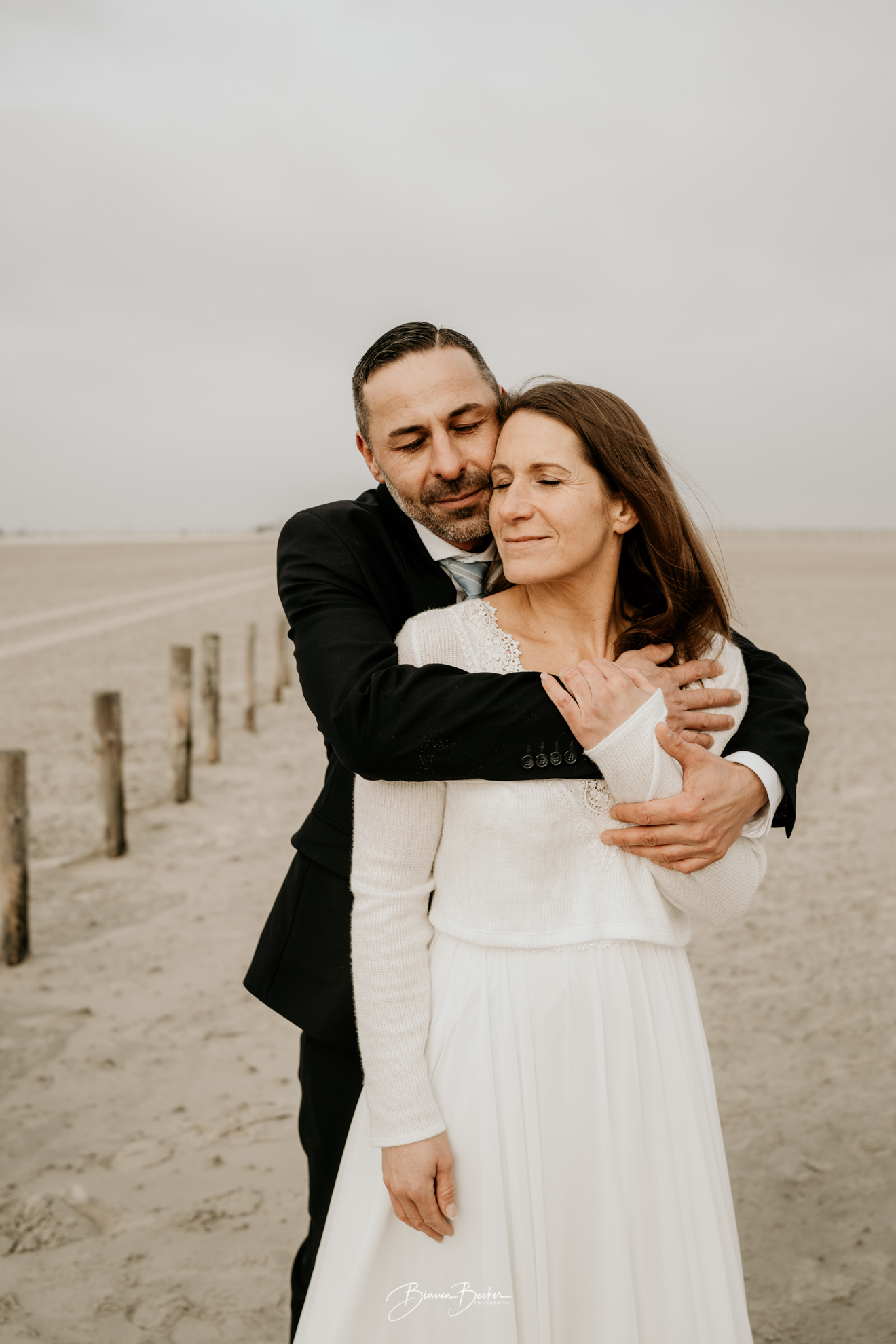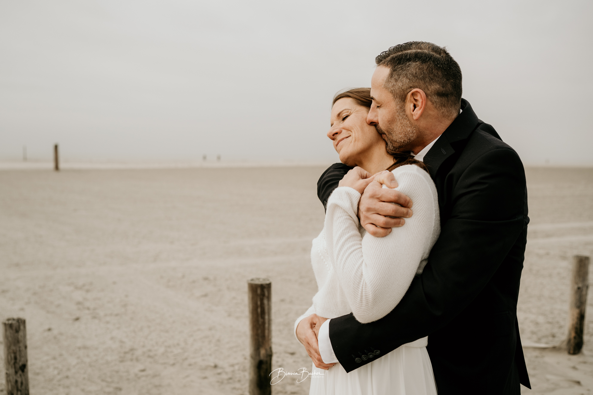 Im Februar begleitete ich ein besonderes Elopement am Strand von Sankt Peter-Ording – ein Moment nur für das Brautpaar und mich als Fotografin, fernab von großen Hochzeitsgesellschaften. Die klare Winterluft, das weite Meer und der beinahe menschenleere Sandstrand boten die perfekte Kulisse für intime, authentische und stilvolle Brautpaarfotos.