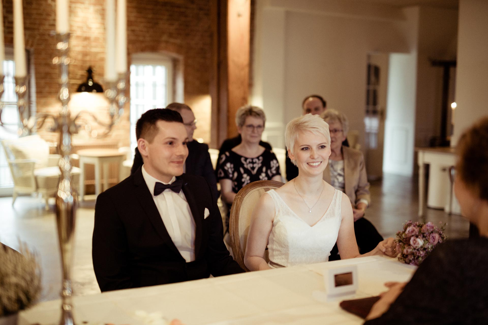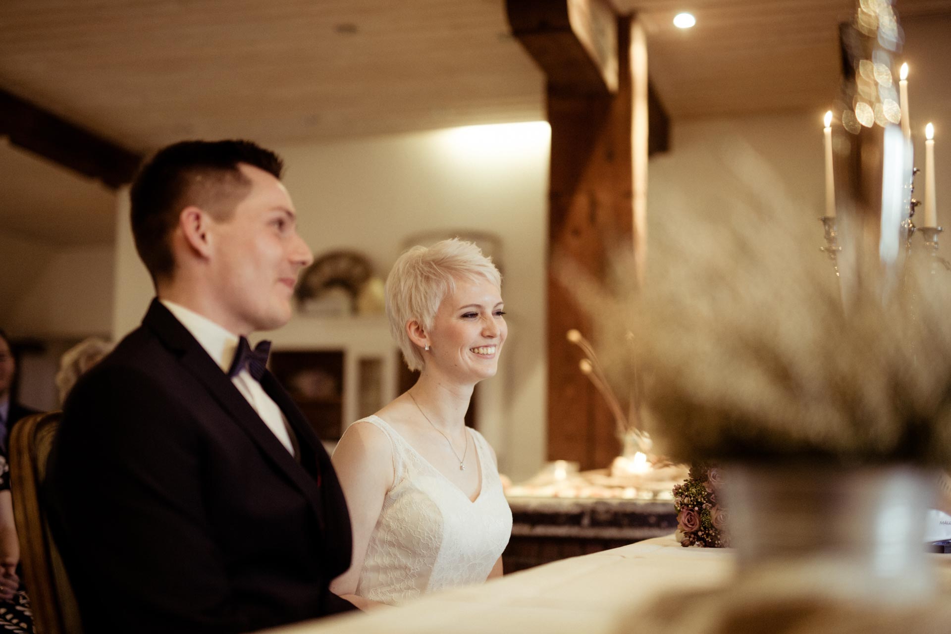 Die Zeremonie findet in den liebevoll dekorierten Räumlichkeiten statt, die eine unheimlich gemütliche und warme Atmosphäre ausstrahlen. Ein perfektes Beispiel dafür war die Hochzeit von Elisa und Mirko im Februar.