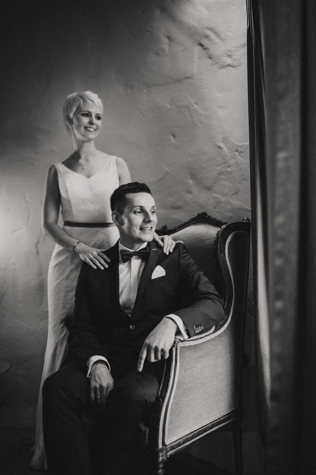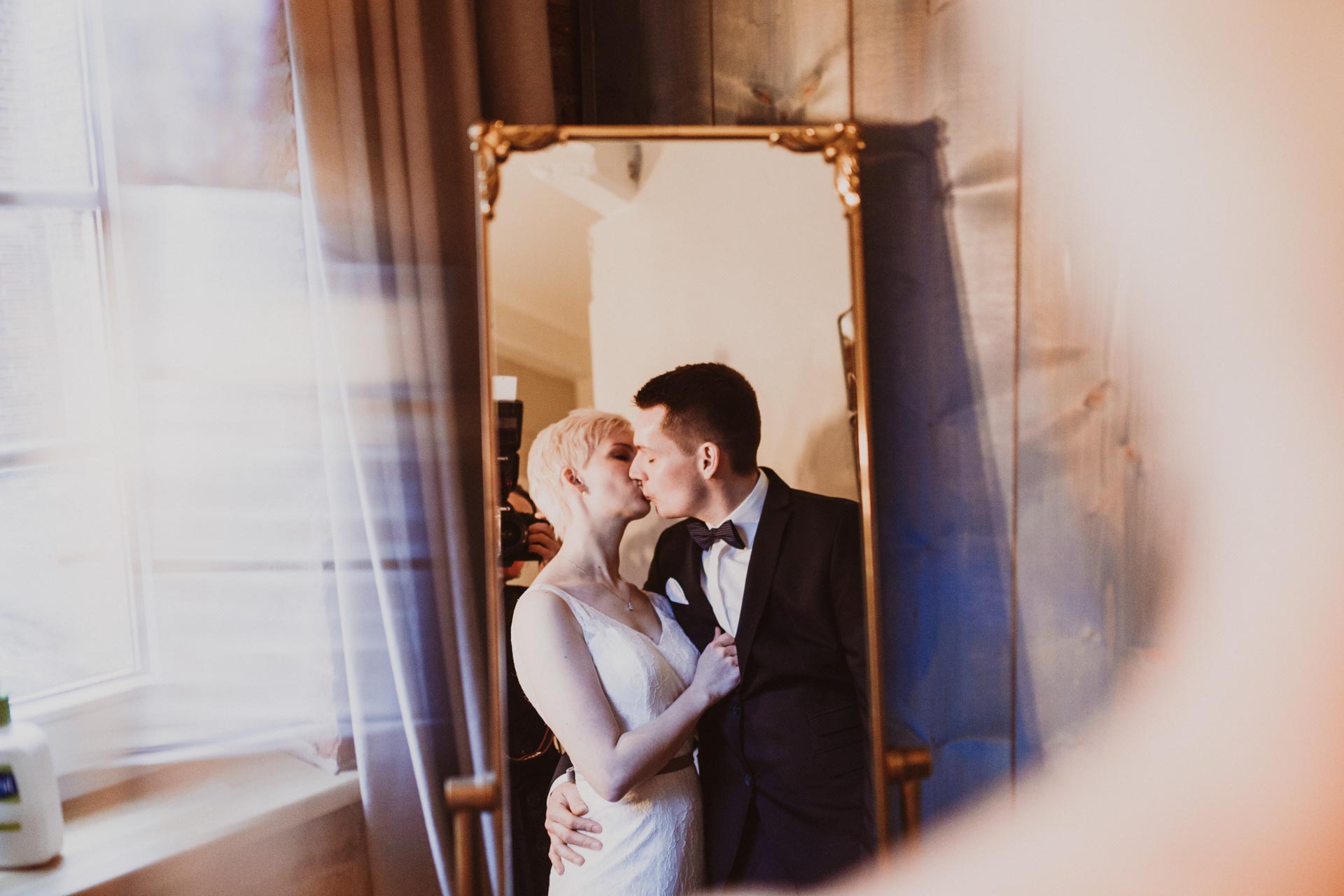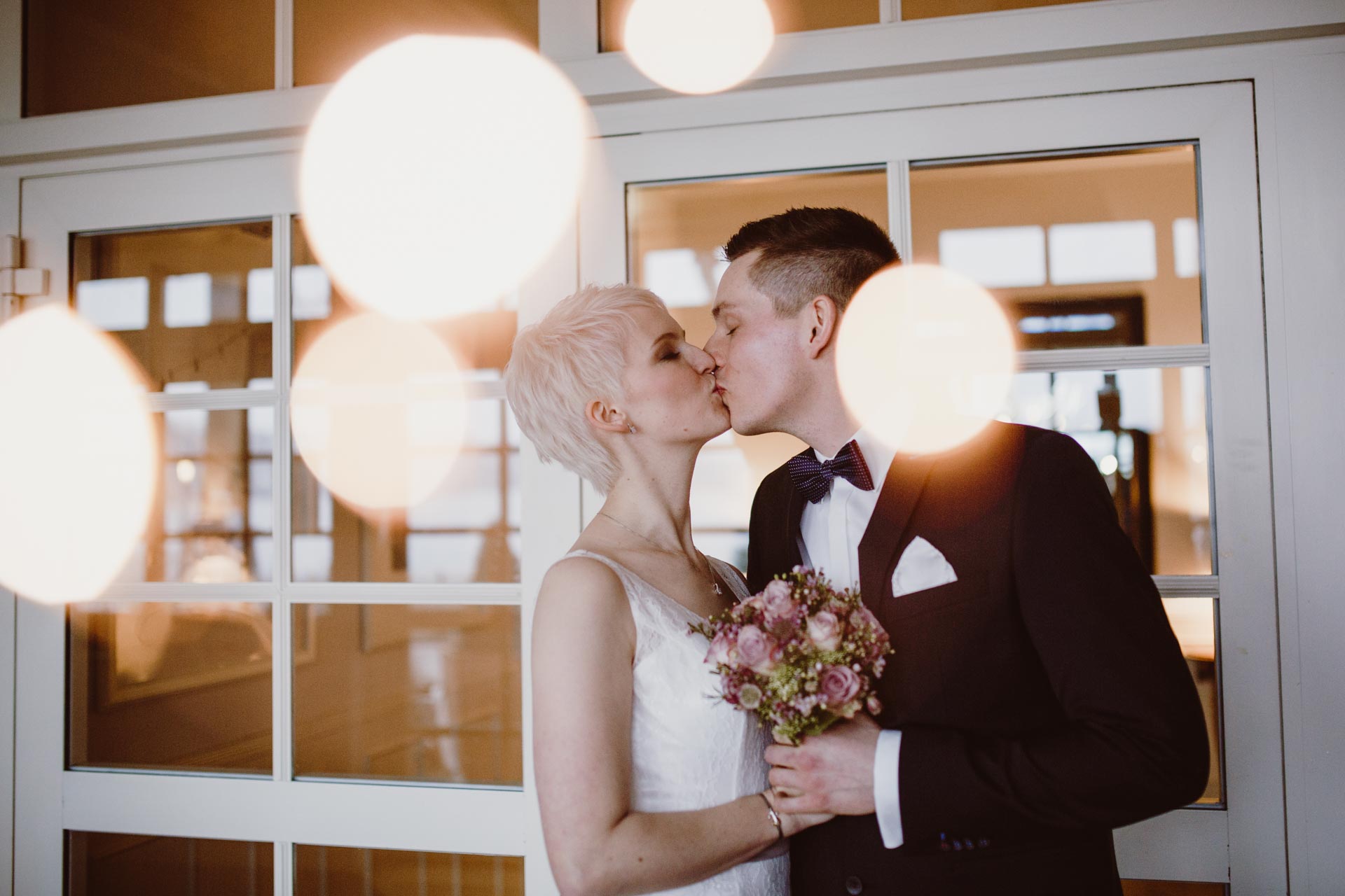 Nach den Familienfotos und dem Brautpaar-Shooting direkt am See haben wir die Kälte hinter uns gelassen und sind in die stylische Hotelsuite gewechselt. Von außen ahnt man gar nicht, wie cool und modern die Zimmer eingerichtet sind. Diese Location ist ein echter Geheimtipp für Paarfotos: Die Räume sind etwas ganz Besonderes und bieten einen tollen Kontrast zur Natur draußen. Es macht einfach riesigen Spaß, hier als Fotografin kreativ zu werden und die Liebe des Paares in diesem besonderen Ambiente festzuhalten.