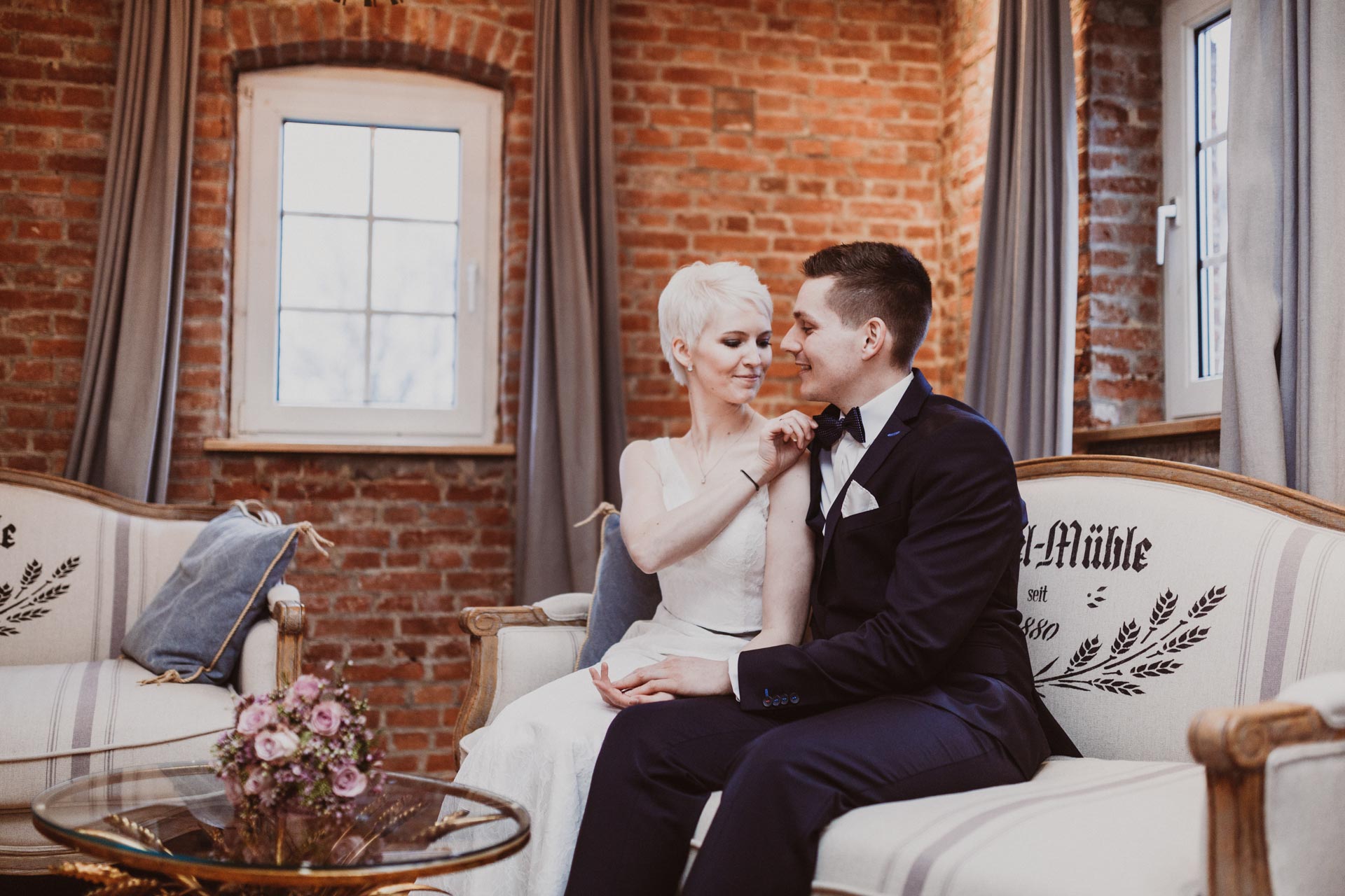Wer nach einem verwunschenen Ort für seine Hochzeit sucht, kommt an der Bokel Mühle am See kaum vorbei. Als Fotografin bin ich immer wieder begeistert von dieser Kulisse, die sich perfekt eignet, um authentische und stimmungsvolle Hochzeitsfotos zu erstellen. Die standesamtliche Zeremonie findet in den Räumlichkeiten der Mühle statt, die mit extrem viel Liebe zum Detail dekoriert sind. Die Atmosphäre dort ist wunderbar warm und gemütlich – man fühlt sich sofort willkommen.