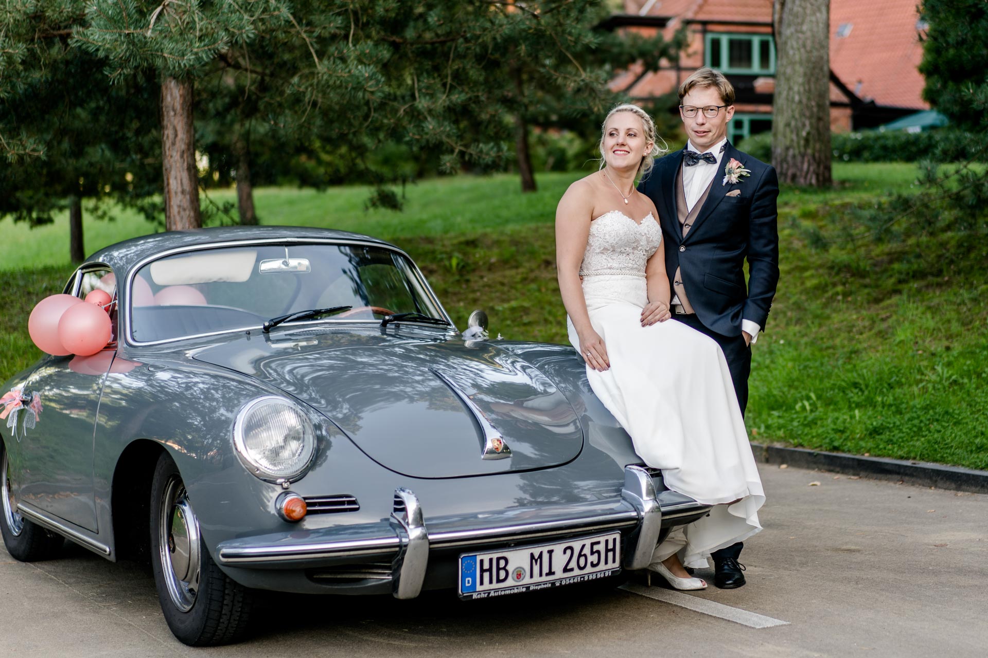 Nach der standesamtlichen Trauung und dem Sektempfang mit Baum pflanzen sind wir in Park nach Worpswede gefahren. Sonja und Marc hatten einen alten Porsche, den wir natürlich auch unbedingt nutzen mussten für unsere Fotos. Ich liebe es Bilder mit Spieglungen zu fotografieren. Dort im Park hatten wir wieder gutes Licht dafür um die Bilder schön natürlich wirken zu lassen.